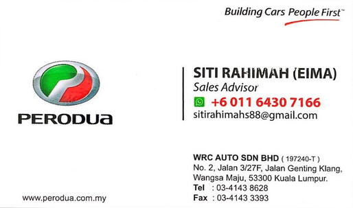 Eima merupakan ejen jualan Perodua yang sah berdaftar di cawangan Wangsa Maju. Dengan pengalaman lebih 5 tahun dalam dunia jualan Perodua, kepakaran beliau dapat membantu mengurus pembelian kereta Perodua pelanggan supaya berjalan lancar.